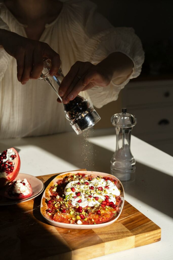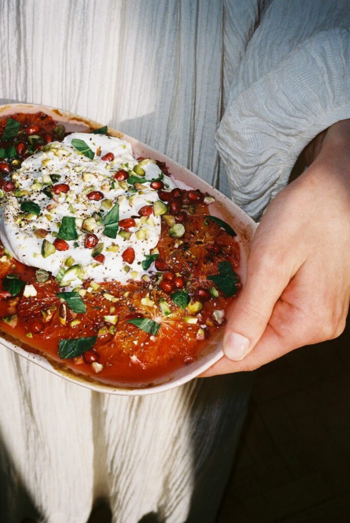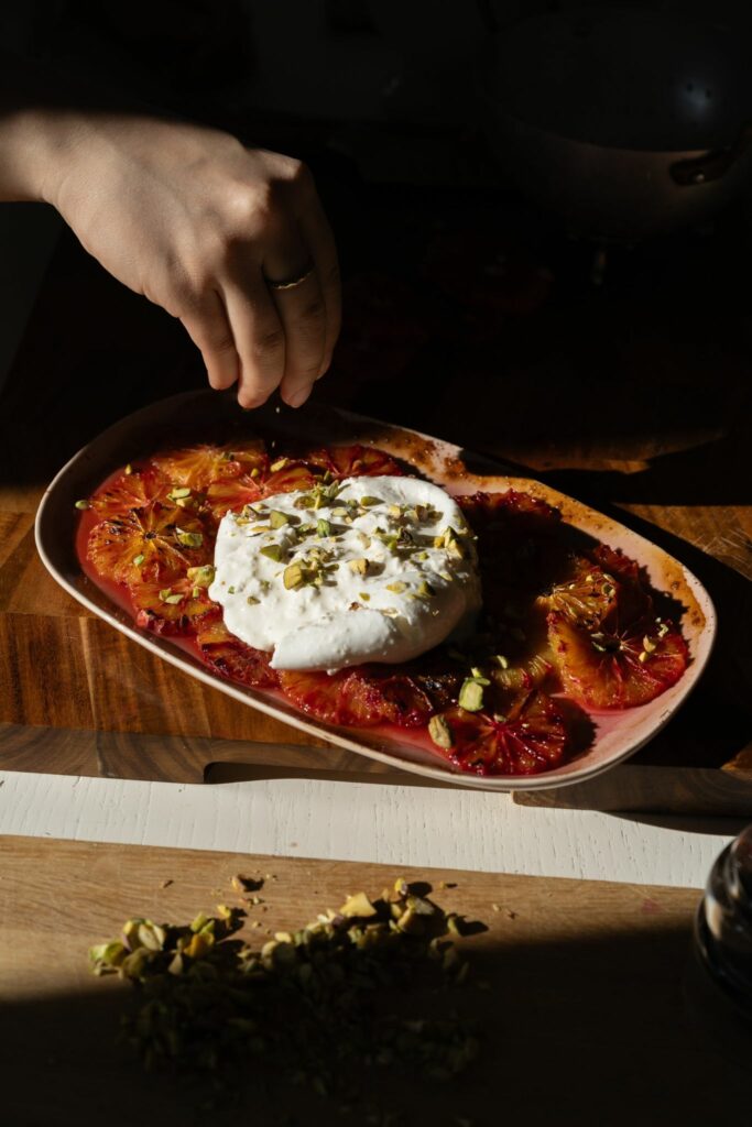 Hiiltynyt veriappelsiini, kermainen burrata ja pistaasipähkinät muodostavat nopean ja yksinkertaisen salaatin, joka tekee varmasti vaikutuksen. Upeat värit ja tekstuurit törmäävät toisiinsa luoden tämän hauskan, maukkaan ja dynaamisen salaatin, jossa on yllättävää savuisuutta.
