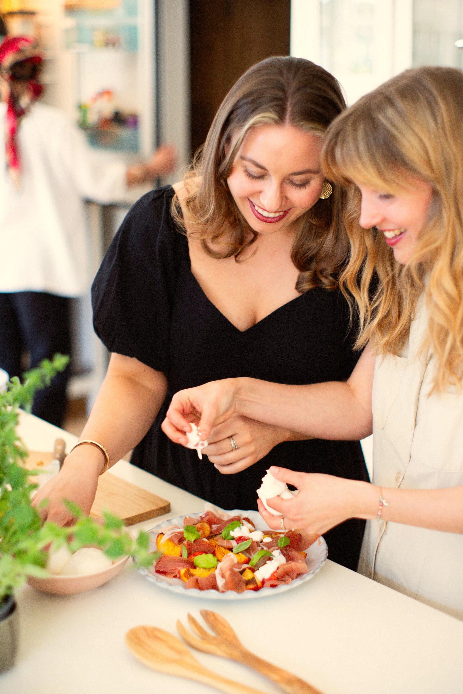 Siirrä nektariinit tarjoilulautaselle. Asettele prosciuttosiivut nektariinien ympärille ja asettele kokonaiset sekä puolitetut burratat niiden lomaan.