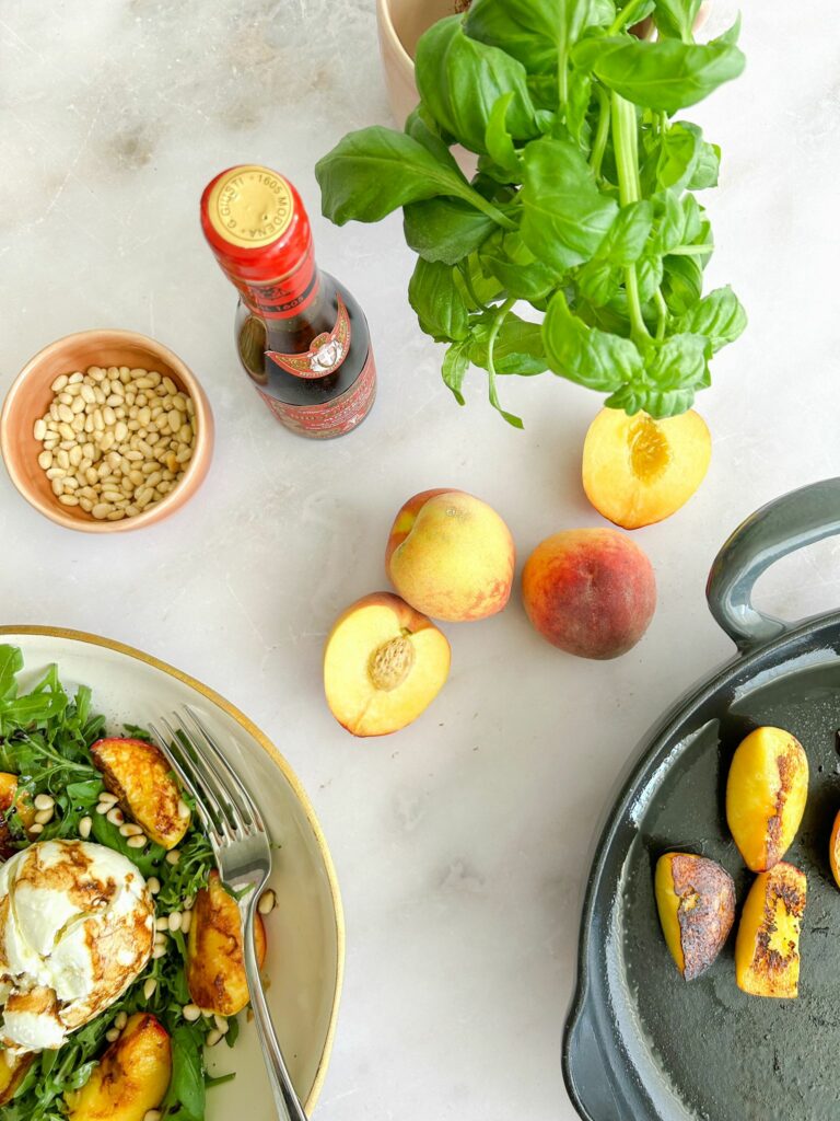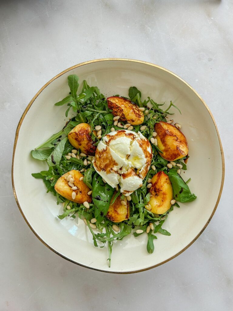 Kokoa salaatti, lisää lautaselle kourallinen rucolaa, persikkapalat ja 1 burrata. Ripottele päälle pinjansiemeniä ja lorauta päälle oliiviöljyä ja balsamiviinietikkaa. Lisää päälle hieman rouhittua mustapippuria ja suolaa.