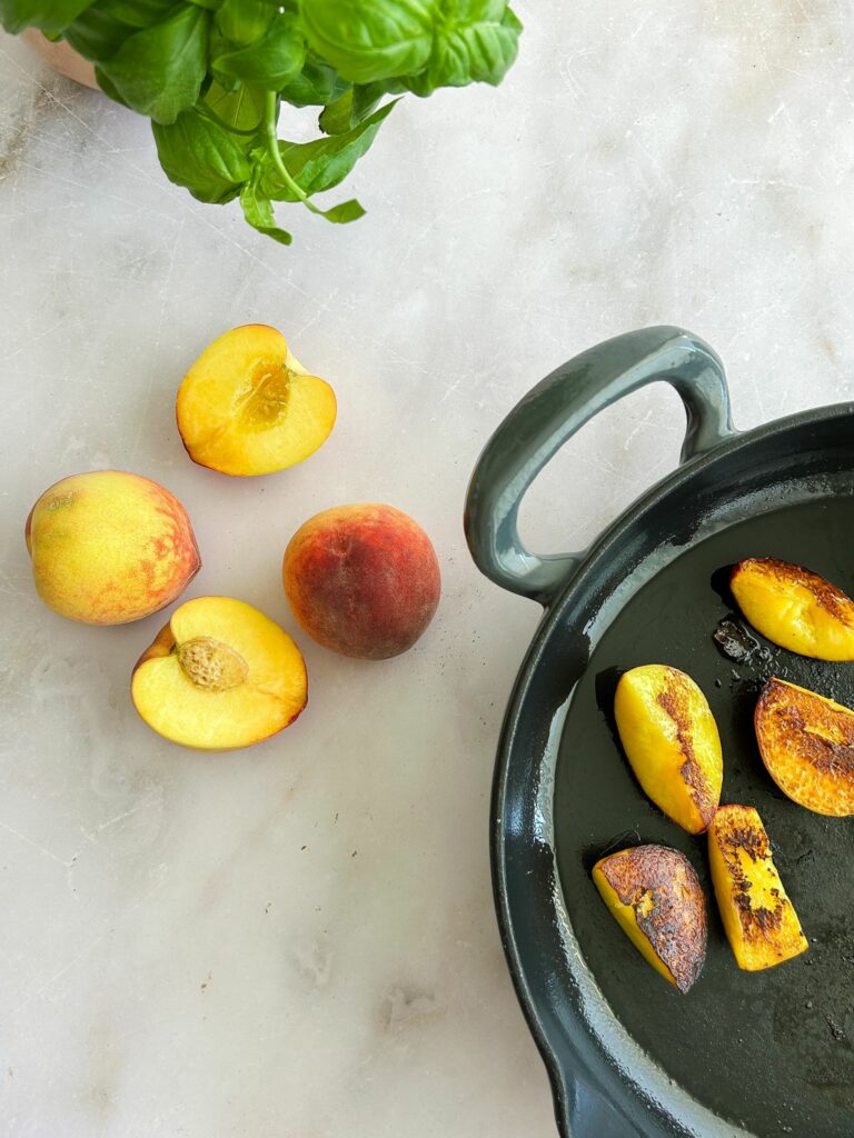 Kuumenna pannu tai grilli keskilämmölle ja leikkaa persikat puoliksi. Sivele persikoiden avoin puoli voilla ja ripottele päälle sokeria. Grillaa/paista persikkaa 2-3 minuuttia kummaltakin puolelta, kunnes avoin reuna on karamellisoitunut.