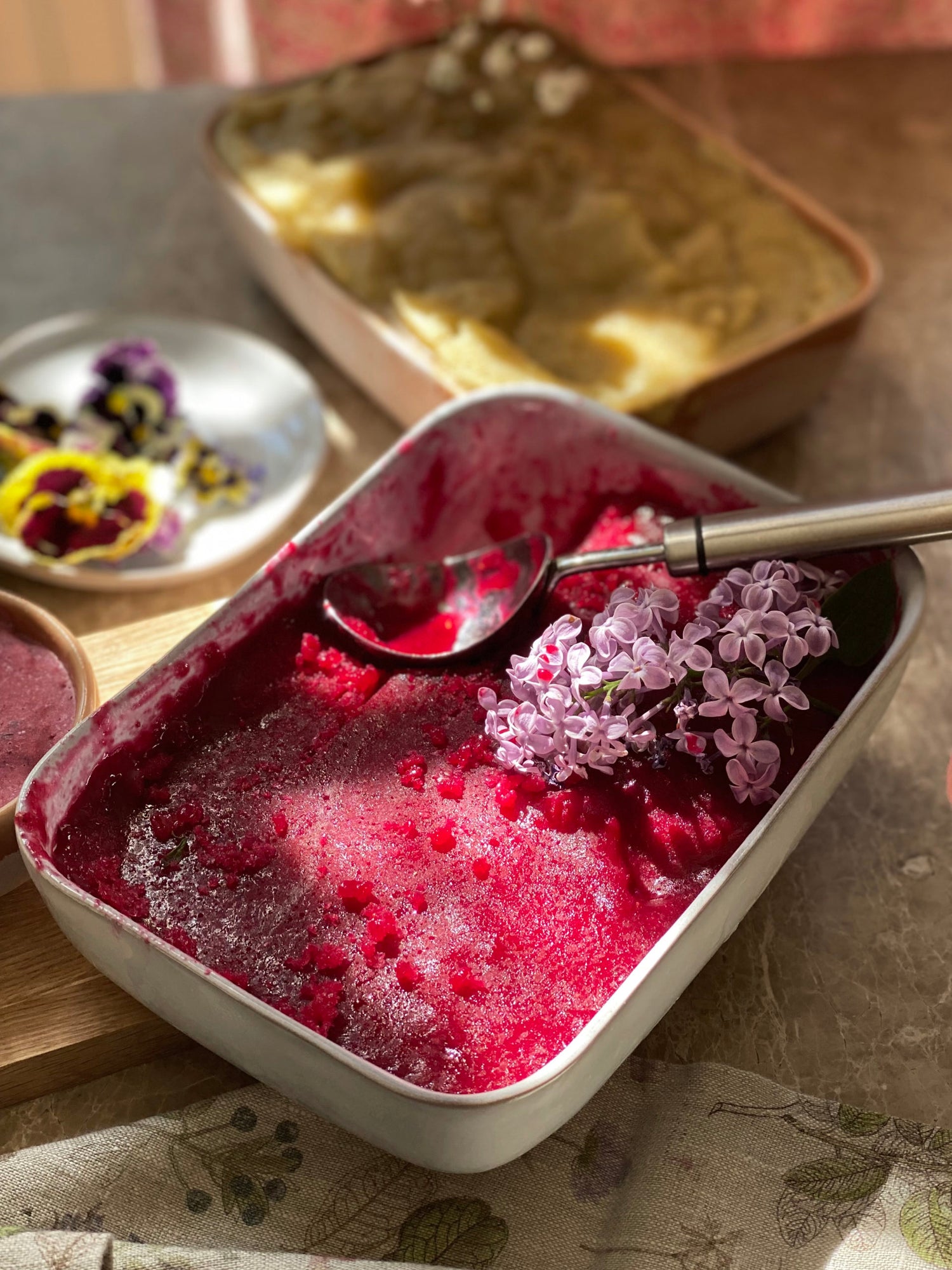 Sorbetin peruskoostumus syntyy vedestä ja sokerista. Massaan voi lisätä pakastusvaiheessa 2 kovaksi vaahdotettua valkuaista, mutta itse oikaisin (tälläkin) kertaa ja jätin ne lisäämättä. Jätin myös sokerin pois ja korvasin sen vaahterasiirapilla. Sokerin määrä vaikuttaa lopputulokseen: mikäli käyttää vähemmän sokeria, tulee sorbetista enemmän kiteistä.