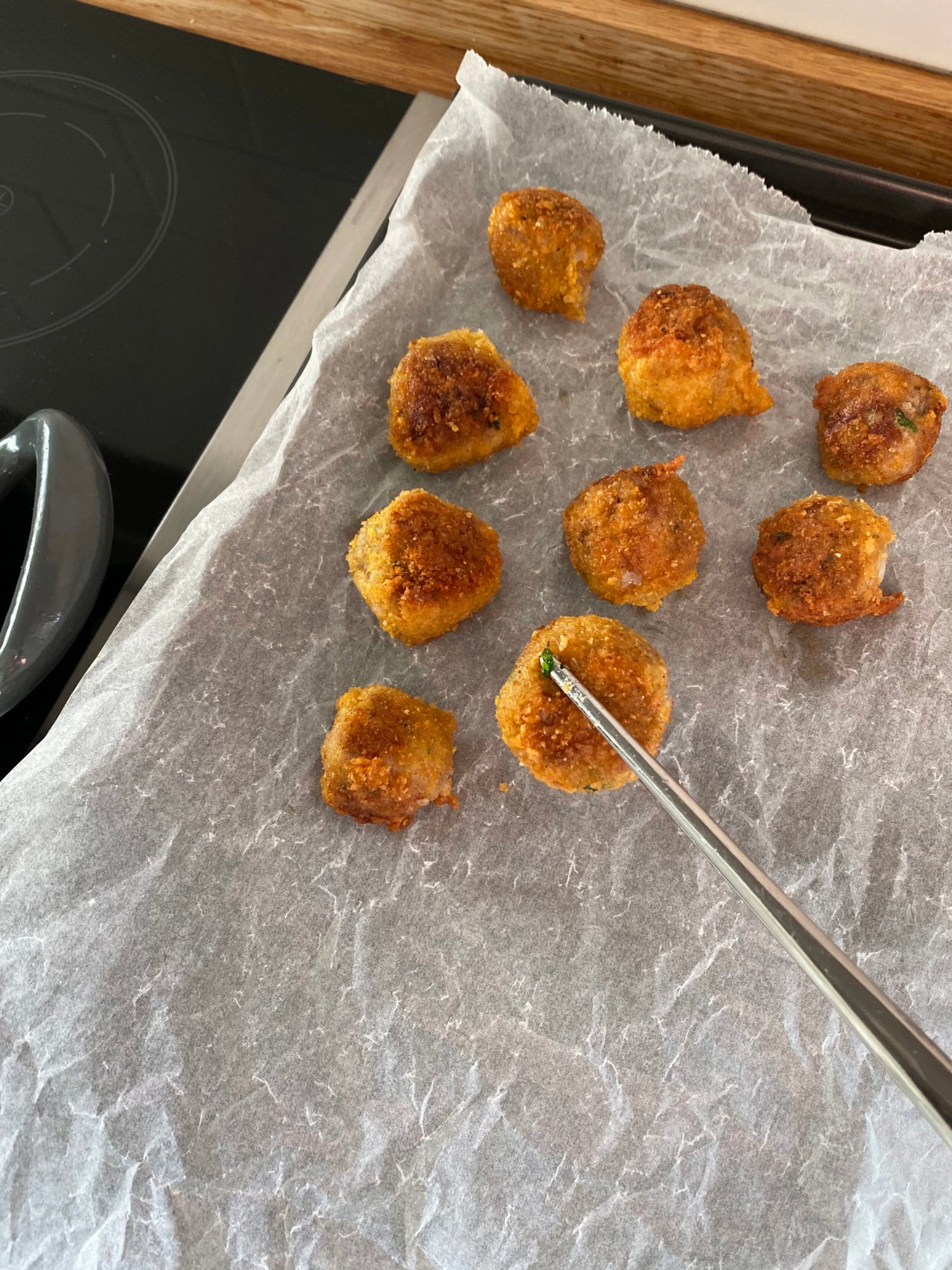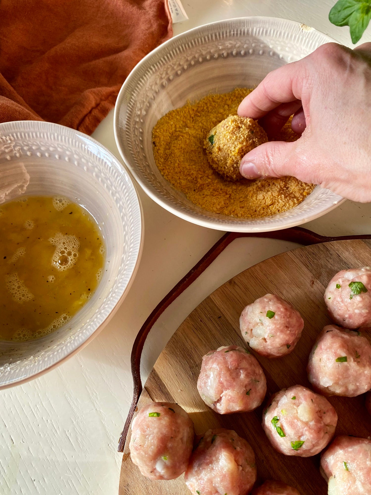 Toisin kuin yleensä, kananmuna ja jauhot lisätään vasta valmiiksi pyöriteltyjen pullien pinnalle. Ensin pyöräytetään kananmunassa ja sitten jauhoissa. Käytin gluteenitonta Pankojauhoa, joka on japanilainen versio korppujauhoista. Ne on tarkoitettu erityisesti leivitykseen ja kuorrutukseen. Niiden avulla saat uskomattoman rapean pinnan.