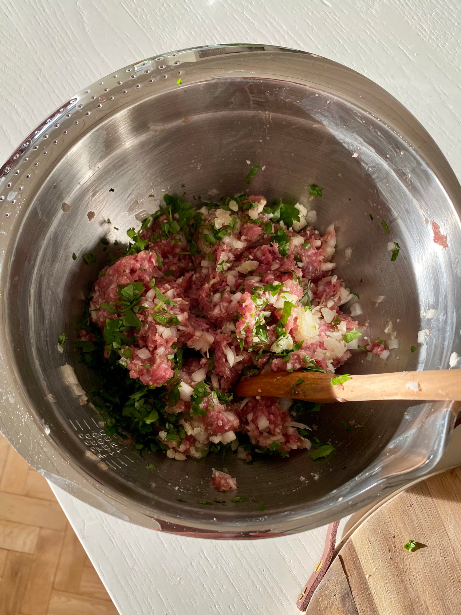 Lihana käytin karitsan jauhelihaa, joka on maultaan mieto ja rakenteeltaan pehmeä. Voit myös käyttää lammasta, mutta suosittelen silloin lisäämään joukkoon possua ja nautaa pehmentämään lampaanlihan voimakasta makua. Esimerkiksi 1/3 lammasta, 1/3 possua, 1/3 nautaa.