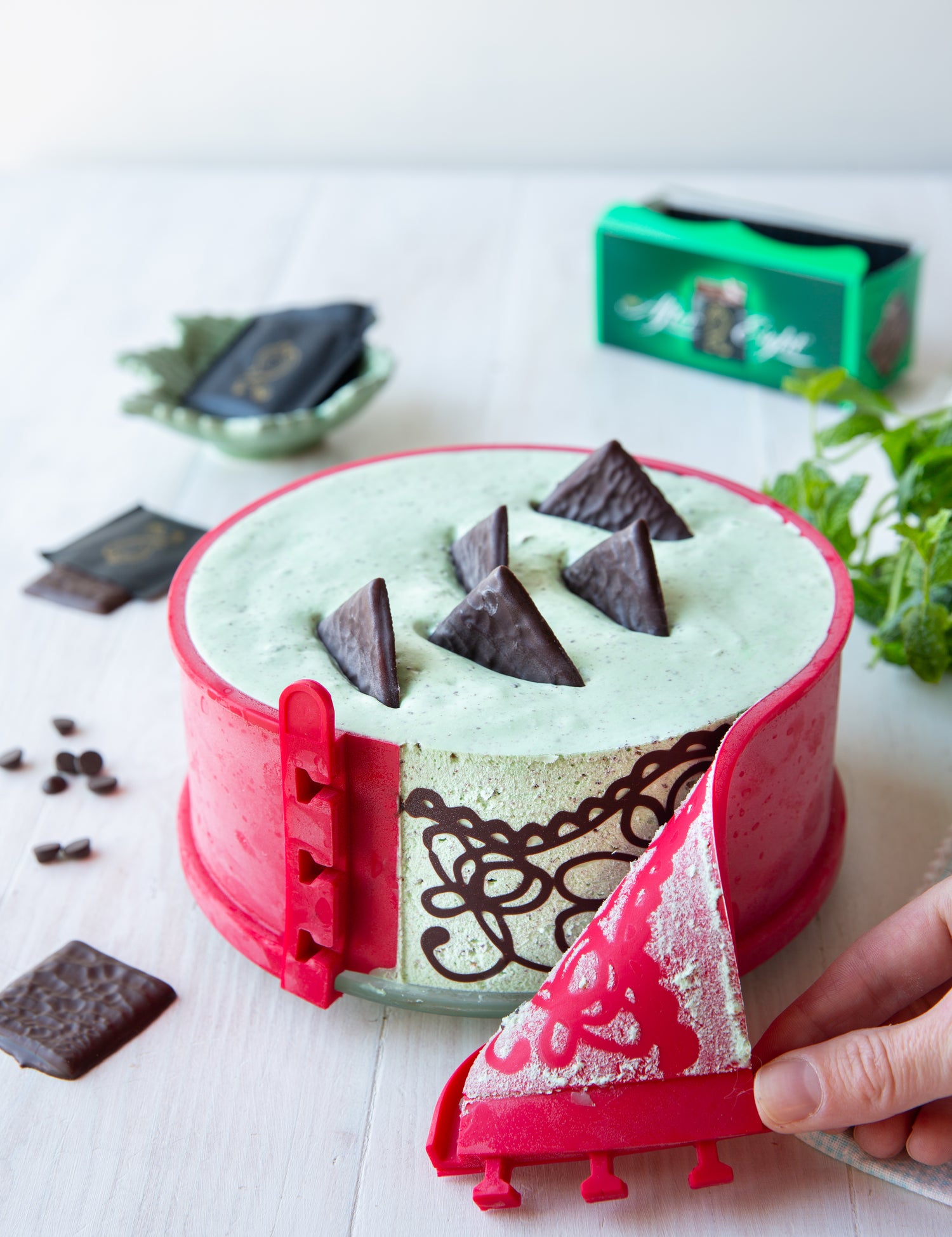 Levitä After Eight -konvehdit leikkuulaudalle ja nosta ne pakastimeen noin tunniksi, kunnes ne ovat kokonaan jäätyneet.Tee sillä välin suklaareunus. Paloittele suklaa lautaselle ja sulata mikrossa miedolla (n. 180 W) lämmöllä välillä sekoitellen.Laita suklaasula pursotuspussiin, jossa on pieni, pyöreä tylla (koko 2 mm).Aseta vuoan silikonireunus pöydälle sisäpinta ylöspäin. Pursota sen päälle suklaasulasta kiehkuroita, siksakkia tai aaltokuvioita oman mielesi mukaan.Laita vuoan lasipohjan reuna silikonireunuksen uraan ja nosta reunus pohjan ympärille. Kiinnitä lukot ja nosta vuoka jääkaappiin.