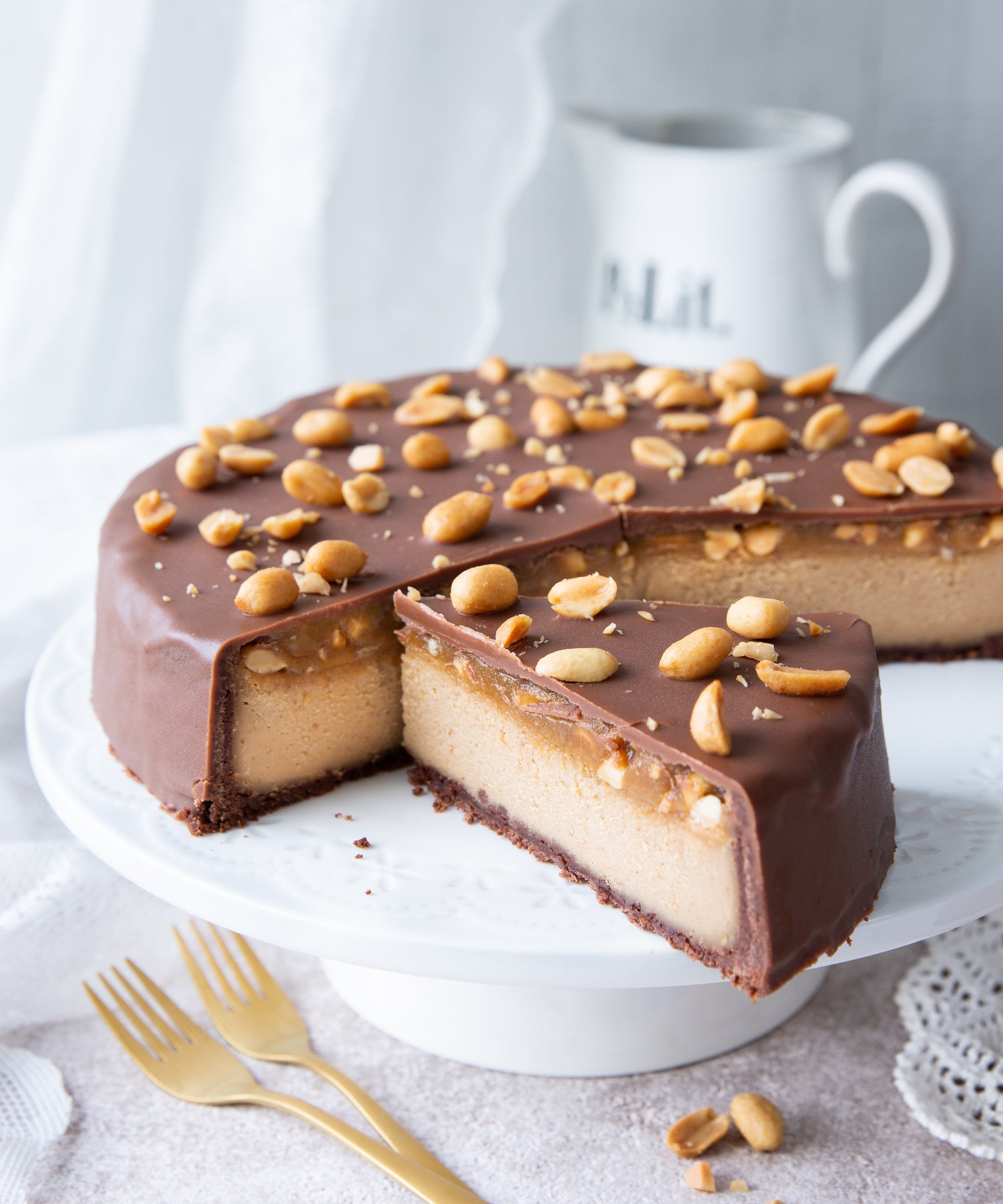 Kakussa yhdistyvät rapea keksipohja, täyteläinen maapähkinävoitäyte, pehmeä kinuski suolaisilla pähkinöillä ja viimeistelynä maitosuklaakuorrute – todellinen makujen ilotulitus!