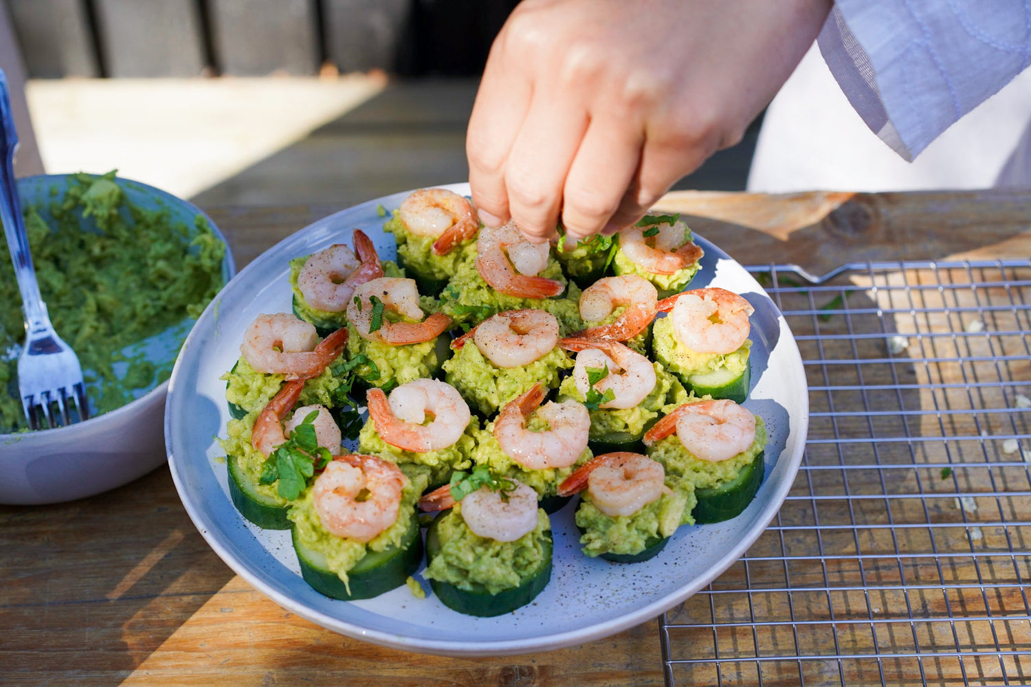 Leikkaa kurkku vajaan sentin kokoisiksi paloiksi. Laita jokaisen palan päälle avokadotahnaa ja yksi paistettu katkarapu.