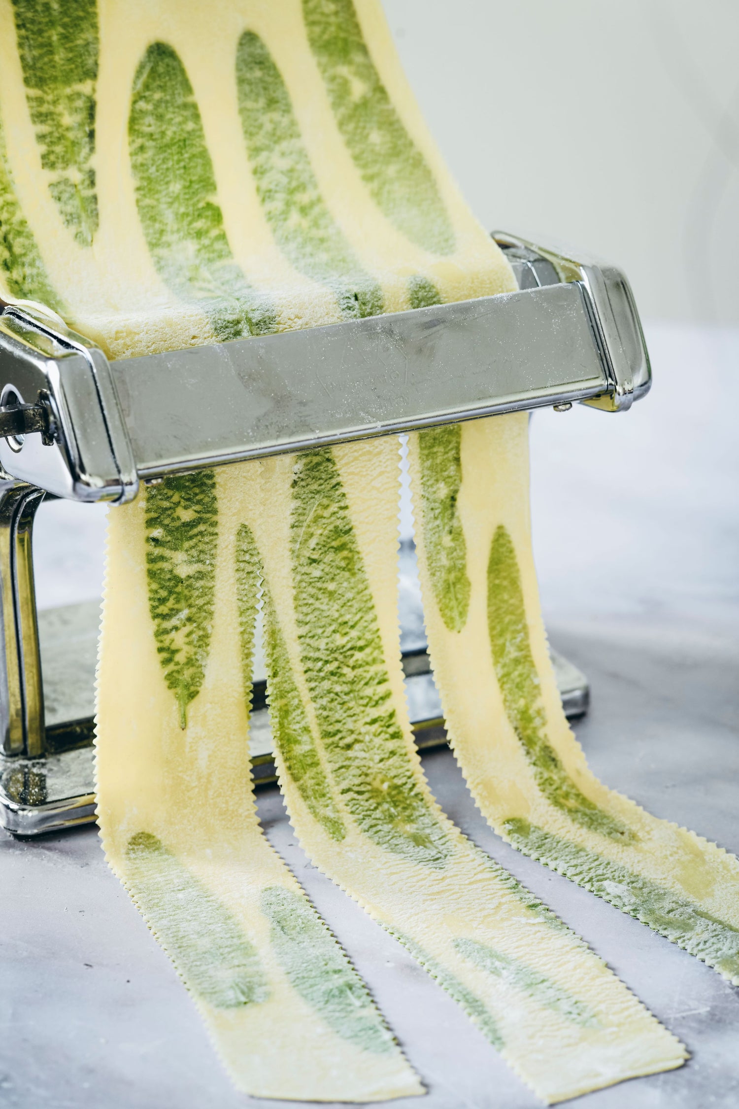 Jaa taikina kahteen osaan. Kauli palat levyiksi. Käytä jauhoa vain niukasti. Pyöräytä taikinapalat yksitellen pastakoneen läpi muutaman kerran leveimmällä asetuksella (0). Siirrä rullien asetus 1:seen ja veivaa taikina pari kertaa läpi. Toista jokaisen leveyden kohdalla, kunnes taikina on pyöräytetty asetuksen 5 läpi kahdesti.