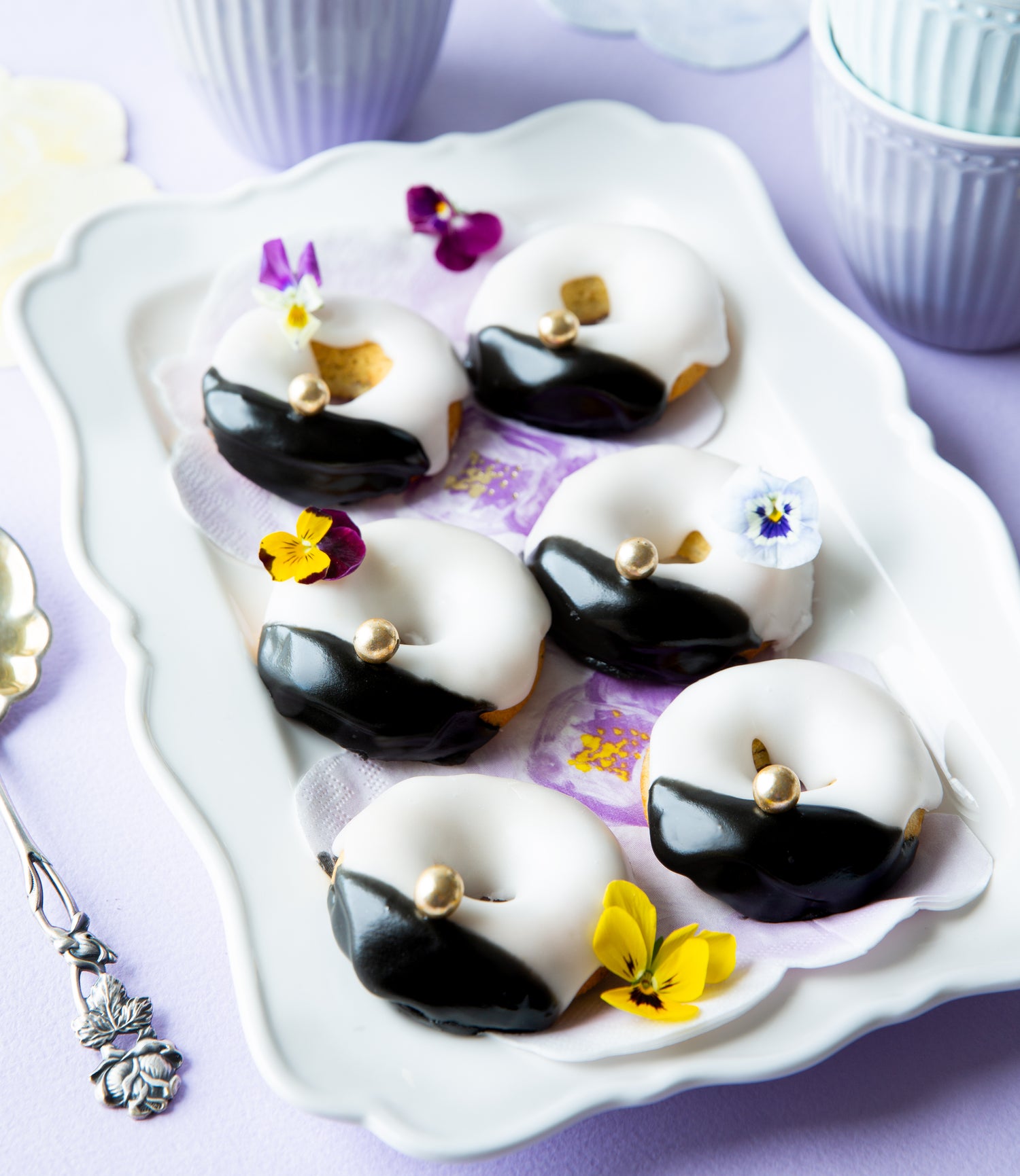Yhdistä tomusokeri ja vesi valkoista kuorrutetta varten. Huomioi, että pienikin nestemäärä vaikuttaa koostumukseen, joten säädä veden määrällä kuorrutteen rakenne sopivaksi. Kuorrute saa olla paksua, mutta kuitenkin tasaisesti levittyvää. Valuta kuorrutetta donitsien päälle lusikalla annostellen. Laita donitsit ritilän päälle, jolloin ylimääräinen kuorrute pääsee valumaan ritilän läpi. Anna kuorrutteen kovettua yhdestä kahteen tuntiin. Yhdistä mustan kuorrutteen ainekset. Huom! Pidä mixeripulloa korkki alaspäin jonkin aikaa ja ravista vielä huolellisesti, jotta väri sekoittuu hyvin. Jätä mustan kuorrutteen rakenne hieman valkoista juoksevammaksi. Kasta donitsien yksi reuna mustaan kuorrutteeseen. Laita kultainen suklaapallo koristeeksi mustan kuorrutteen rajakohtaan. Anna jähmettyä ritilän päällä.