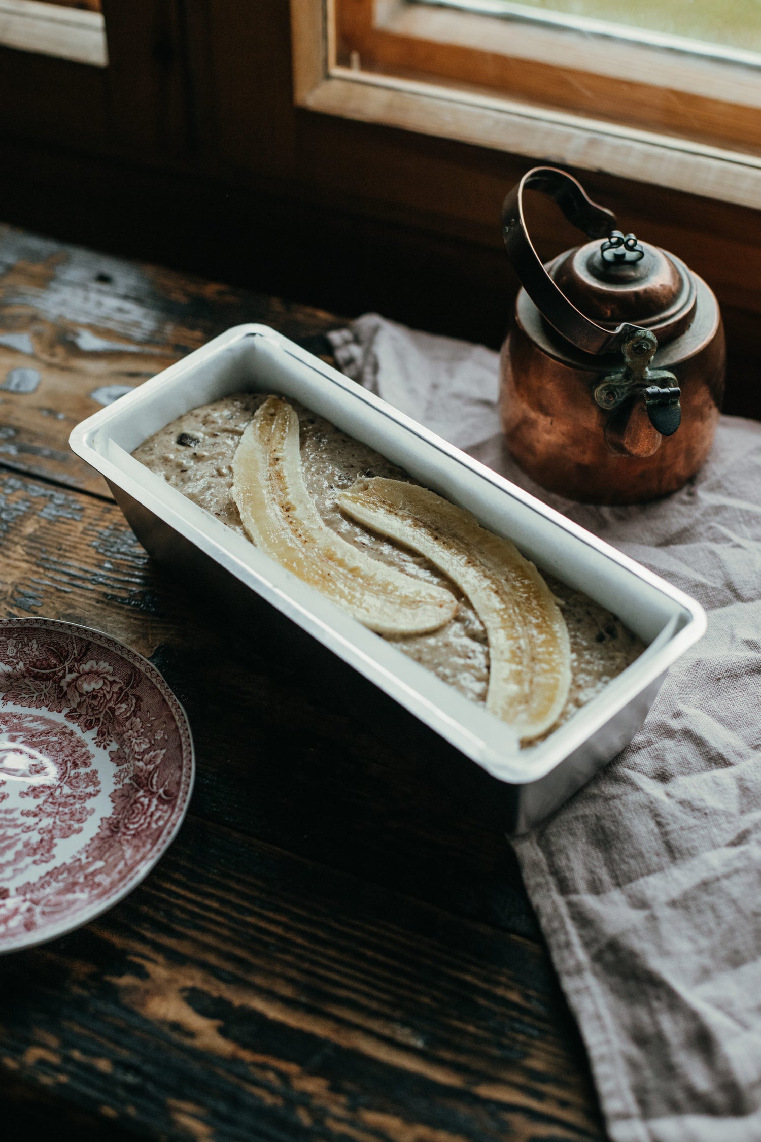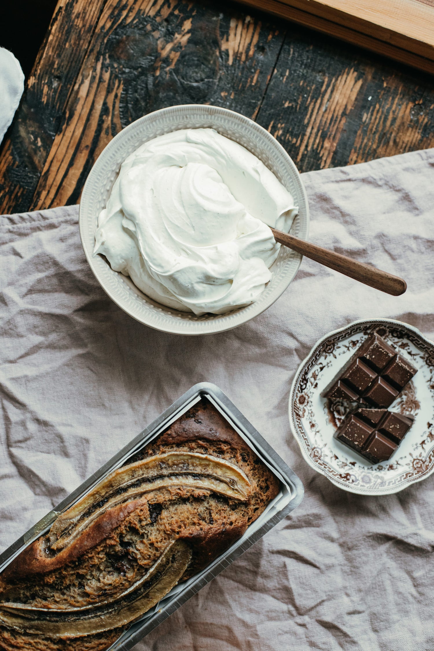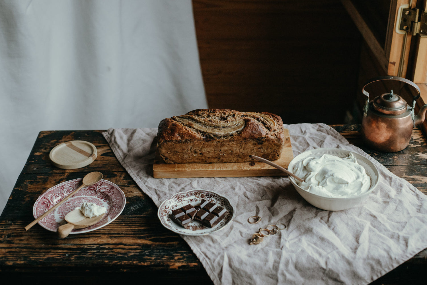 Greetings from Tammisaari, a small town just waken from its winter sleep! I’ve been here that one magical week of the year when the sun melts ice in the sea and one can have the first-morning swim in the sea. As my April recipe, I want to share an easy and delicious chocolaty banana bread with white chocolate whipped cream. The dessert goes with afternoon coffee or brunch and it lasts for a couple of days on the counter as a quick snack. You can also make the most wonderful French toast with leftover banana bread! The next day, I packed a yoga mat, chamomilla tea, a slice of banana bread, and white chocolate whipped cream in a jar, and went on a hike in the forest nearby. It was so calming to do a soft yoga flow in the evening sun and afterward enjoy the flavors of banana and chocolate, sit in silence and listen to the sea. <3