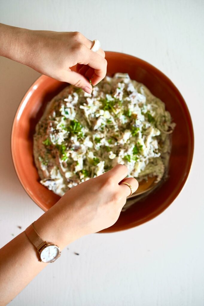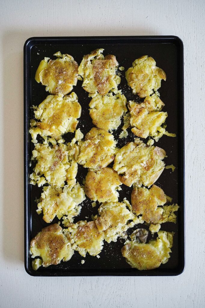 Preheat the oven to 220°C. Cook the potatoes for 8 minutes or until they are soft. Drain and transfer to a baking tray. Use the bottom of a glass to smash them flat. Brush them with olive oil and season with salt and pepper to taste. Roast for 50 minutes to 1 hour or until golden brown and crispy! Mix the yoghurt, mayonnaise, dijon, lemon juice, vinegar, garlic, dill, parsley, salt and pepper to taste. Taste and adjust if necessary. Stir in the cucumber and shallot, cover and refrigerate while the potatoes are in the oven. When the potatoes have cooled for 5 minutes, chop them into smaller pieces and mix them into the salad so that they are completely covered.