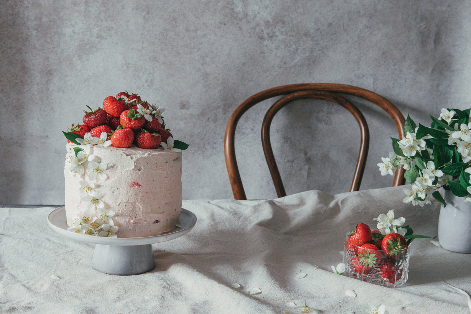The inspiration for this Garden Party Strawberry Cake I got from a birthday party I attended in the early summer. For dessert, there was this tall, light pink strawberry dream. It had dulche de leche, lots of fresh strawberries, and a frosting made with cream cheese and whip cream. Afterward, I realized I hadn’t stopped dreaming of the cake and decided to recreate it.