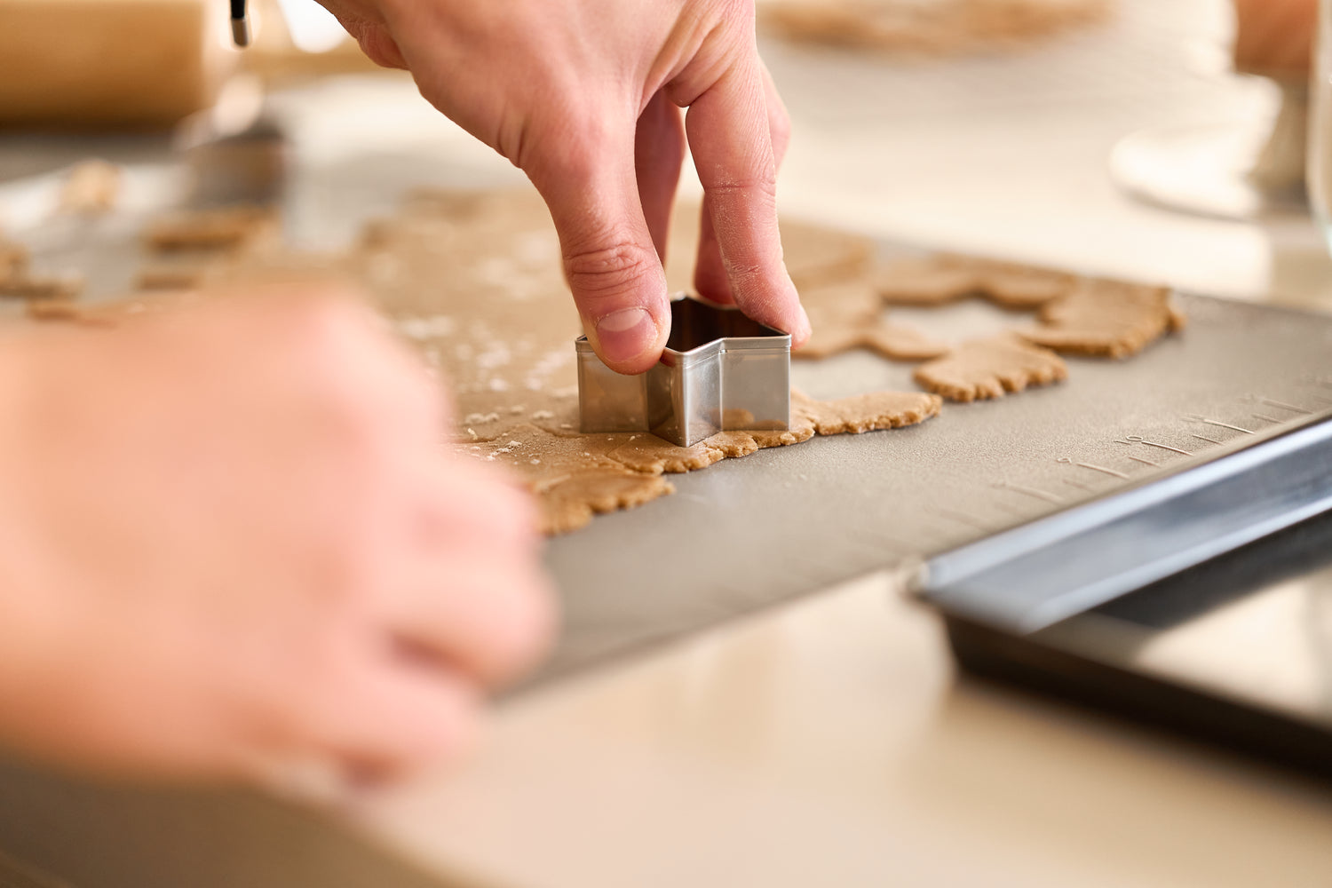 Preheat the oven to 175 °C and line a baking sheet with parchment paper. Roll out the ready-made gingerbread dough on a lightly floured surface to about 3–4 mm thickness. Use a star or heart-shaped cookie cutter to cut out as many cookies as possible. Place the cookies on the baking sheet and bake for 7–10 minutes. Let them cool completely on a wire rack.