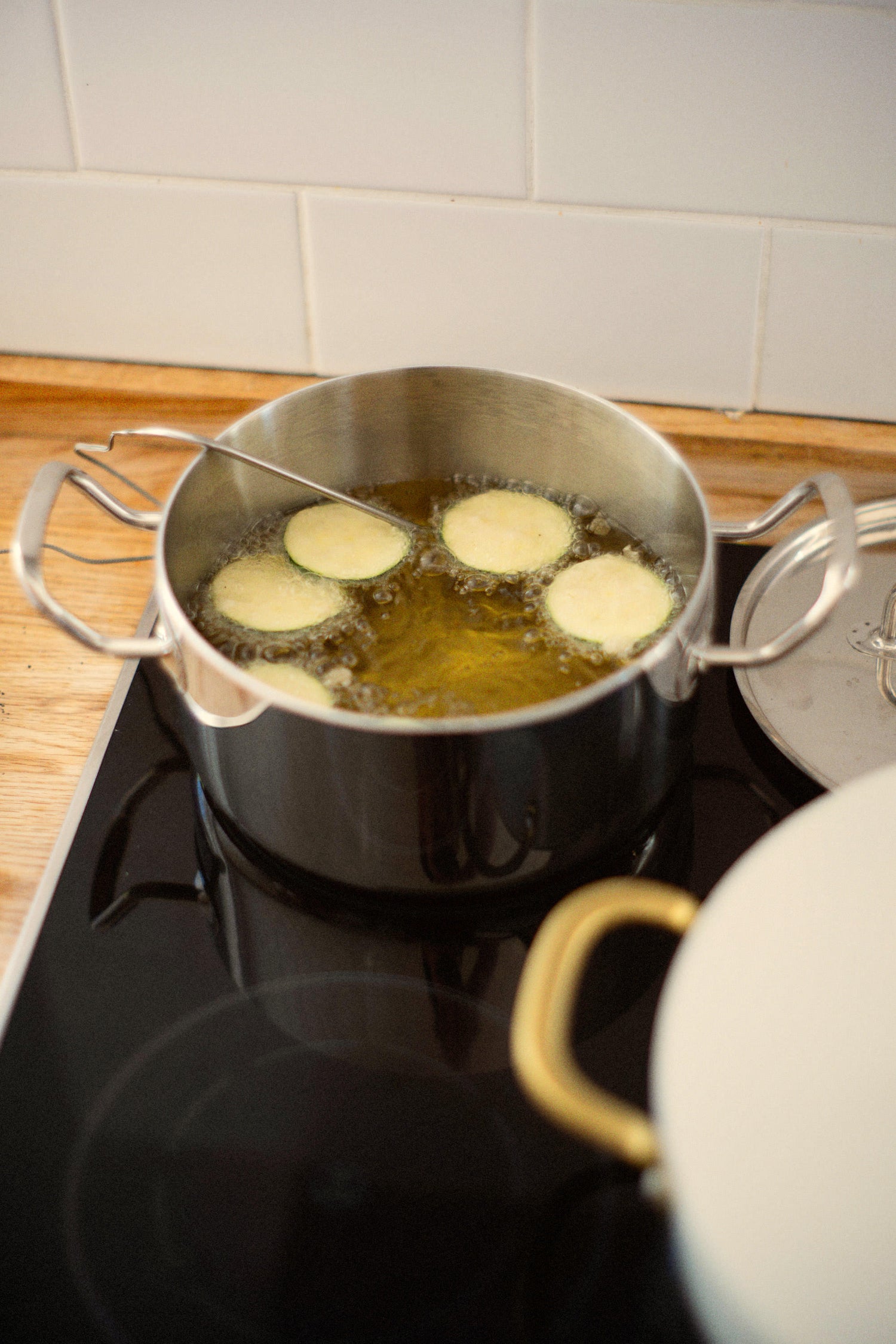 Slice the zucchini and aubergine into 1 cm thick rounds. There’s no need to peel them just wash thoroughly before slicing. In a bowl, whisk together flour, sparkling water, salt, and pepper until you achieve a smooth, lump-free batter.