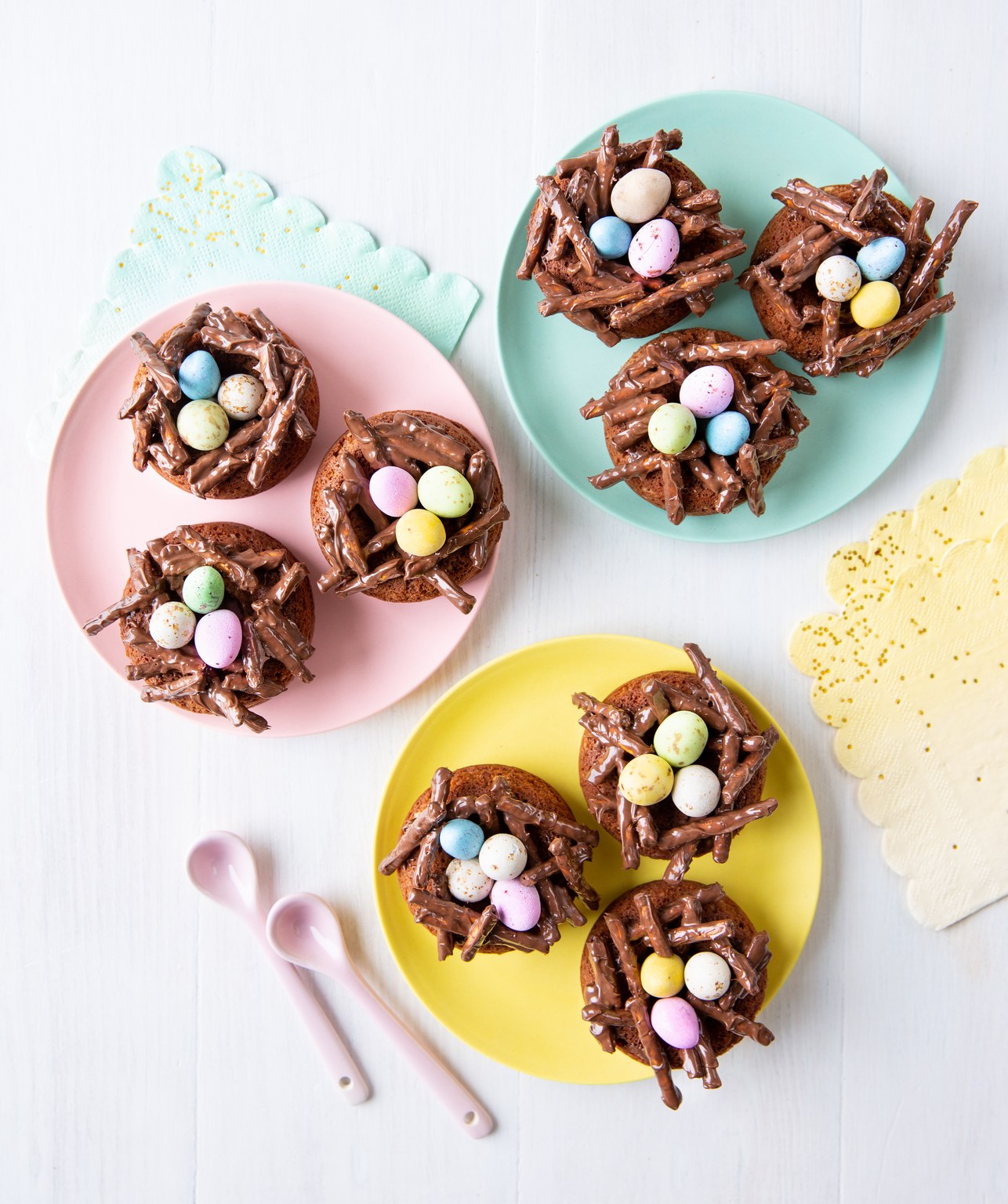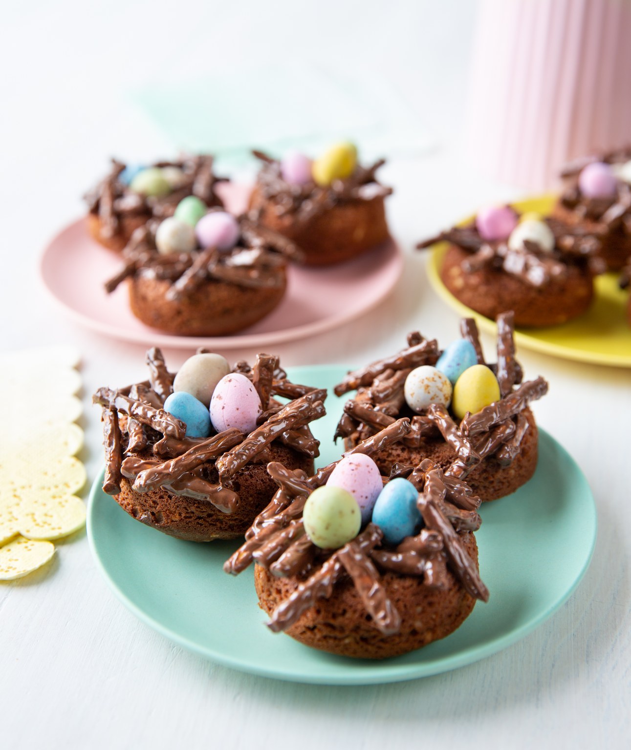 The secret to the deliciousness of these Easter-themed donuts is the hazelnut chocolate spread, which adds flavor to the dough and also works as a decoration. Using the shape of the donut, little bird's nests have been created. The combination of pretzel sticks and hazelnut chocolate spread creates a nest-like texture, and the colorful Easter egg candies finish off the spring look.