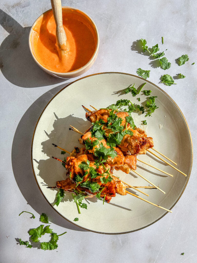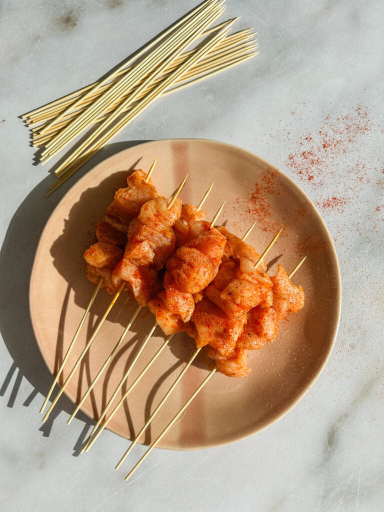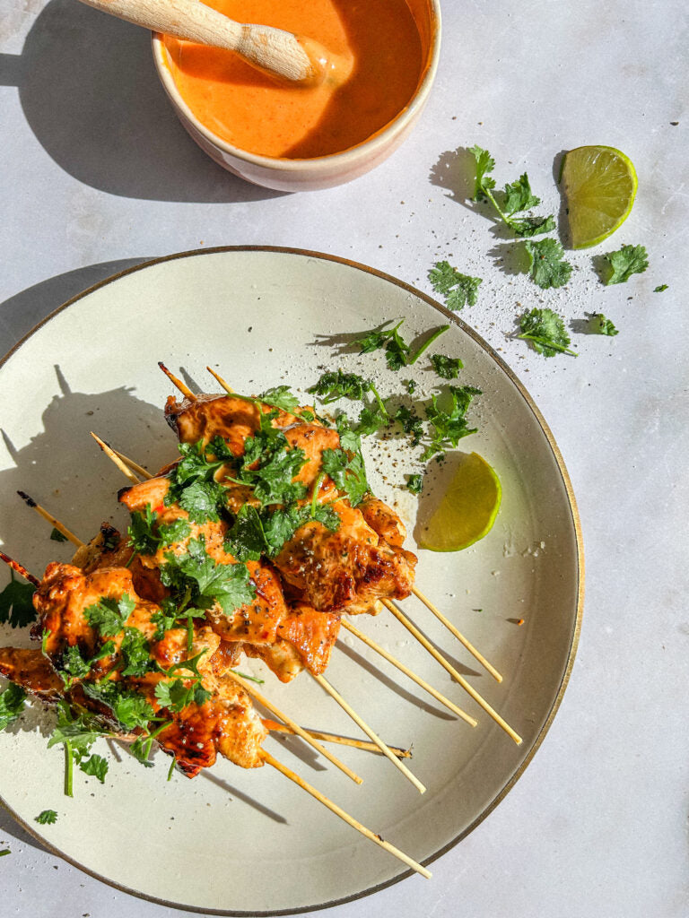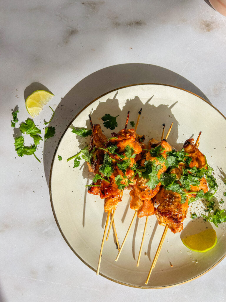 In a bowl, combine the diced chicken breasts, oil, paprika, garlic powder, salt and pepper. Stir to evenly coat the chicken with the spices. Slide 4-5 chicken cubes onto skewers one skewer at a time. In a small bowl, mix mayonnaise, sweet & sour sauce, Sriracha and honey. Mix well. Pour half of the sauce into a separate bowl and set aside to use after the chicken is cooked. Use the rest of the sauce by brushing evenly over the chicken. Add the skewers to a warm pan with oil and cook for 10-15 minutes, depending on the size of the chicken pieces (make sure they cook all the way through). Transfer the skewers to a plate and drizzle or brush with the reserved sauce. Top with fresh coriander and serve immediately.