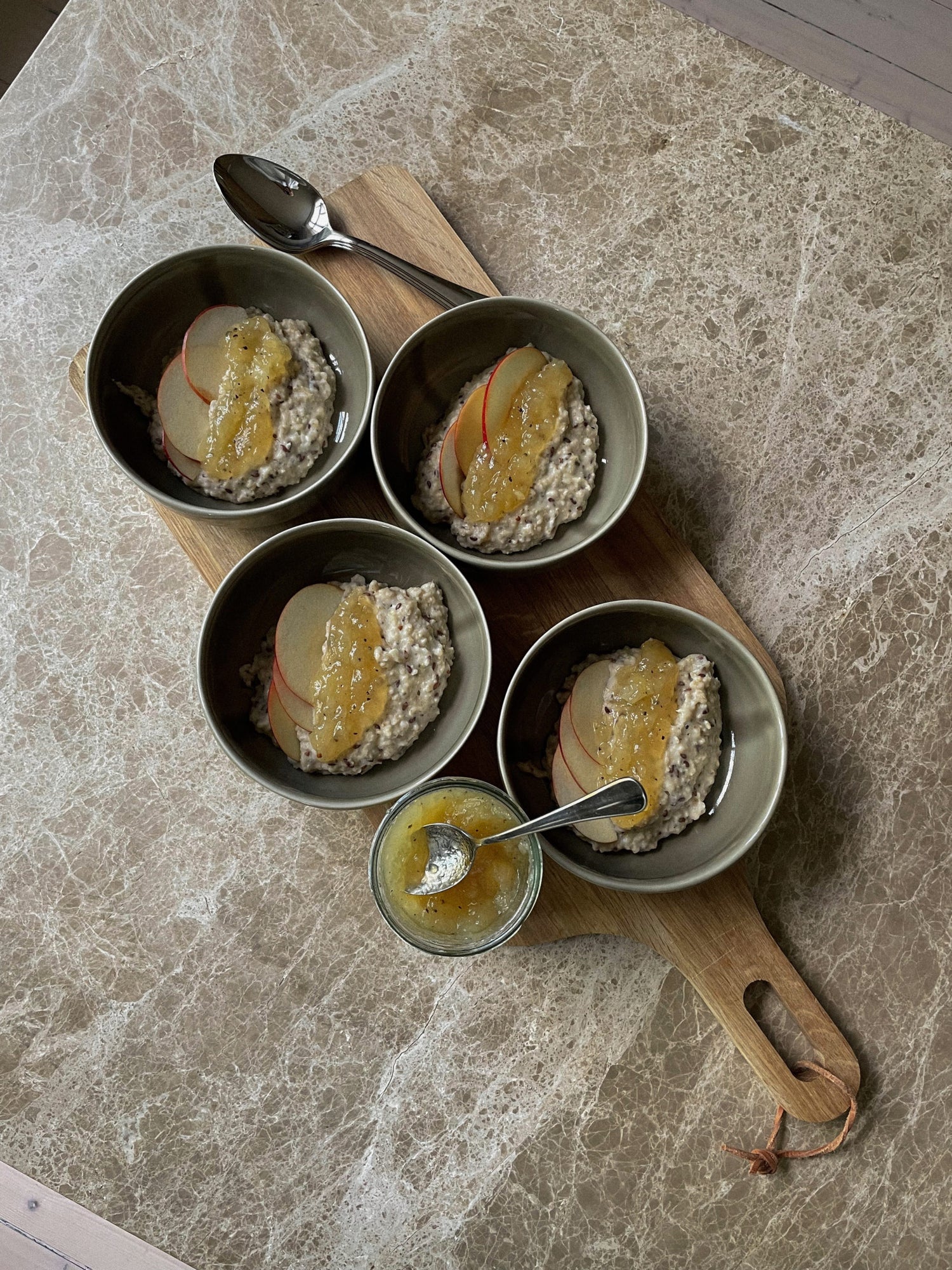 It was only 5 degrees out this morning, so I figured to warm my coworkers up with some porridge during our coffee break. A part of the reason to make porridge was a jar of homemade apple sauce, that Pirkko, the wife of our coworker Jokke, had made for us. The apple sauce on its own was to die for and I would probably eat it every morning if I could. Cardamom has this cozy fall flavor to it and the lemon adds a perfect amount of sour to balance out the sweetness.